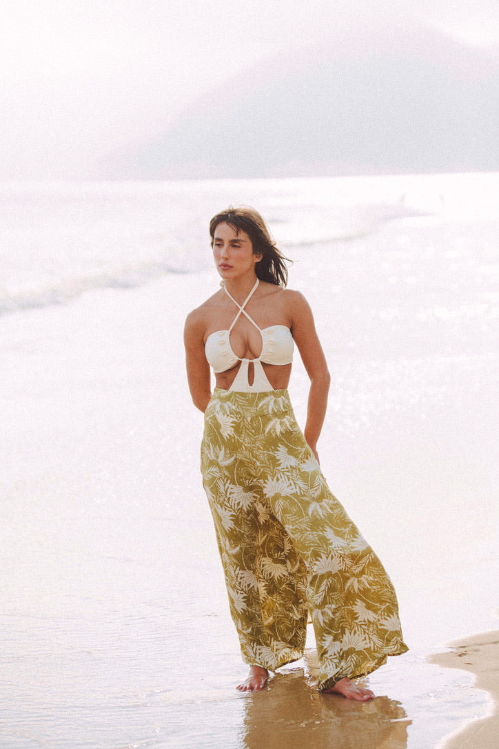 The Zoe One-Piece is where beach sensuality meets sculptural elegance. Designed with a bandeau-inspired top and a striking central cutout, it frames the body in a way that feels bold yet refined. The crossed halter ties add a subtle statement while allowing adjustable support, and the delicate búzios details bring a natural, coastal soul to the piece.