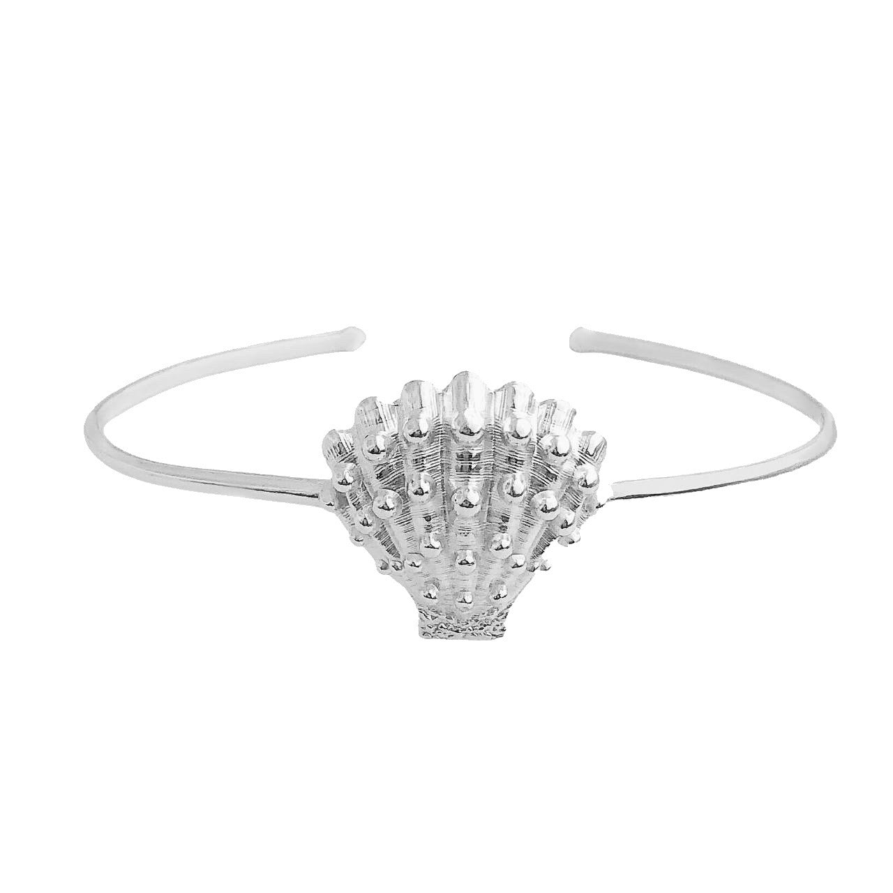 The Seashell Soul Bracelet wraps your wrist in soft ocean energy. A textured silver scallop shell rests at the center of a sleek and comfortable band, bringing light and meaning to your every move.